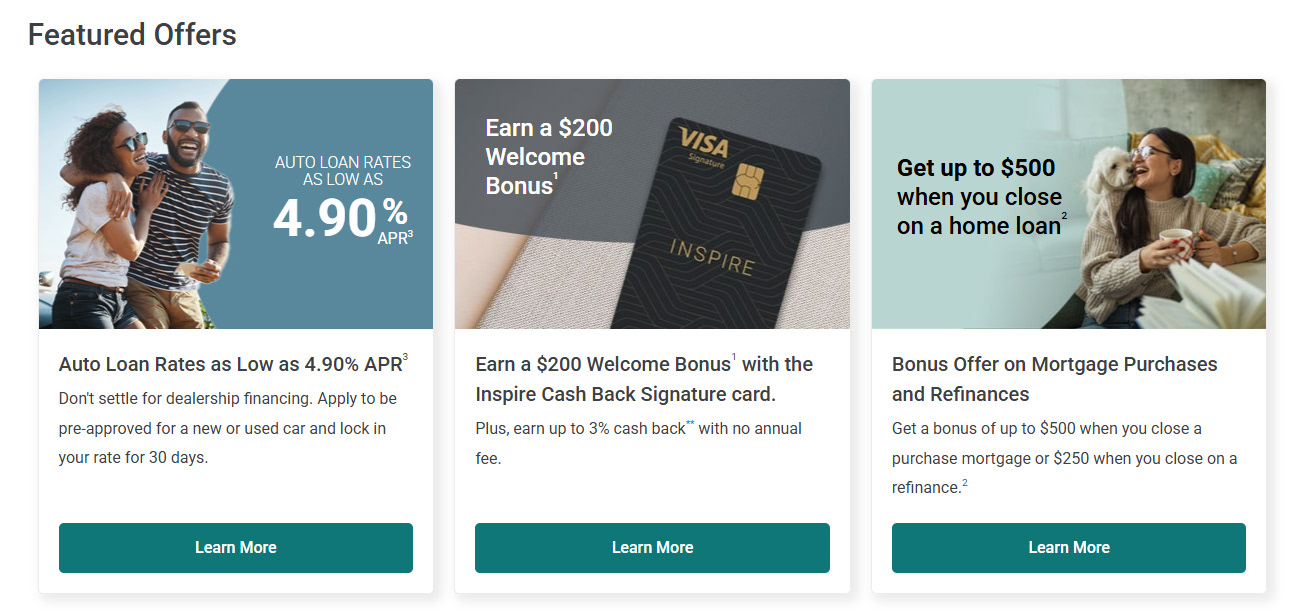 These Featured Offer cards are a prominent fixture of the website's homepage and act as a catalyst to engage members in learning more about timely special offers. When viewed as a whole, these ads must maintain a consistent look and feel and promote brand consistency with regard to typography, color, use of shape elements and layout, yet be different enough from each other to make each offer stand out in its own way.