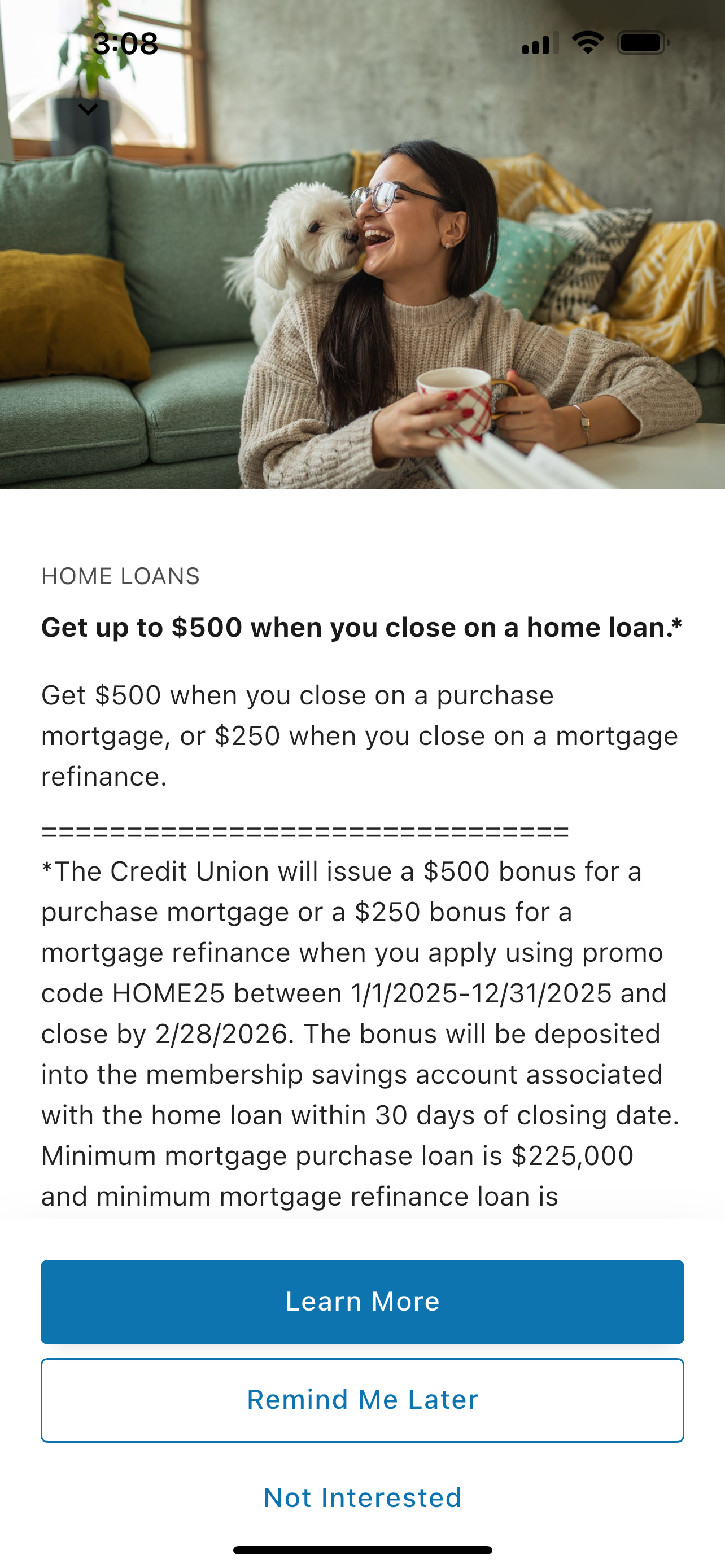 I was also responsible for creating all the in-app ads that appear in the Credit Union's digital banking app. The login screen of the app is the first, as well as one of the greatest, opportunities to promote products and services. I created this welcome bonus offer using a mix of stock and in-house imagery assets along with a brand-identifiable semi-transparent shape element at the top. The typography was carefully crafted to match branding standards and make use of the brand's distinctive arrow, pointing out the URL of the website where members can find more information regarding the bonus offer. While this ad type was not tracked for engagement, it served as a lead element of the overall in-app campaign. Subsequent in-app ads, such as navigation banners or interstitials, made use of this ad's design (color, imagery and layout) to portray a unified look and feel for the campaign.